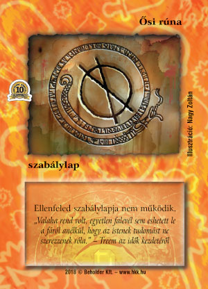 Kiadás: Ezüsthajnal, Alappakli, 10. kiadás, Védnök 2025 Gyakoriság: ritka Lapszín (isten): Nincs Típus: szabálylap Szöveg: Az ellenfél szabálylapjának hatása nem érvényesül. Szinesítő szöveg: "Valaha rend volt, egyetlen falevél sem eshetett le a fáról anélkül, hogy az istenek tudomást ne szerezzenek róla." - Treem az idők kezdetéről Illusztráció: Nagy Zoltán