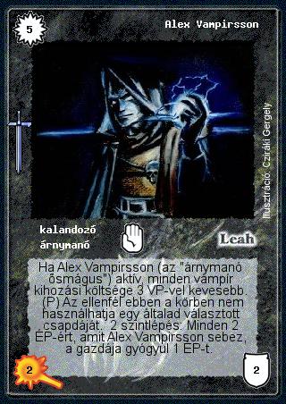 Kiadás: Hőskorszak, Védnök 2023 Gyakoriság: nem gyakori Lapszín (isten): Leah Típus: kalandozó Altípus: árnymanó Szöveg: Ha Alex Vampirsson (az "árnymanó ősmágus") aktív, minden vámpír kihozási költsége 3 VP-vel kevesebb. (P) Az ellenfél ebben a körben nem használhatja egy általad választott csapdáját. 2 szintlépés: Minden 2 ÉP-ért, amit Alex Vampirsson sebez, a gazdája gyógyul 1 ÉP-t. Illusztráció: Cziráki Gergely