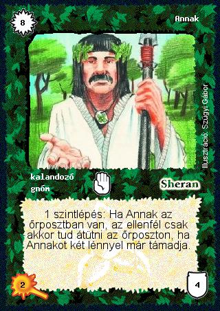 Kiadás: Alappakli, 1. kiadás, Alappakli, 2. kiadás, Alappakli, 3. kiadás, Alappakli, 4. kiadás Gyakoriság: nem gyakori Lapszín (isten): Sheran Típus: kalandozó Altípus: gnóm Szöveg: 1 szintlépés: Ha Annak az őrposztban van, az ellenfél csak akkor tud átütni az őrposzton, ha Annakot két lénnyel már támadja. Illusztráció: