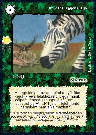 Kiadás: Mérleg (Csillagképek) Gyakoriság: ritka Lapszín (isten): Sheran Típus: bűbáj Szöveg: Ha egy lényed az asztalról a gyűjtőbe kerül (kivéve feláldozástól), egy másik célpont lényed kap egy jelzőt, ami +1 sebzést és +1 ÉP-t jelent (életmentő hatásként nem alkalmazható). Szinesítő szöveg: "Ha jobban megfigyeljük, a természetben egyensúly van. Az egyik lény halála a másik növekedését szolgálja."-Dong Fóliáns Illusztráció: Bőjthe Csaba