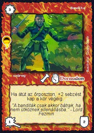 Kiadás: Aranyforrás, Túlélők Földje Gyakoriság: gyakori Lapszín (isten): Dornodon Típus: szörny Szöveg: Ha átüt az őrposzton, +2 sebzést kap a kör végéig. Szinesítő szöveg: "A banditák csak akkor bátrak, ha nem ütköznek ellenállásba." - Lord Fezmin Illusztráció: