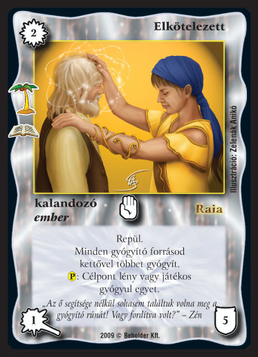 Kiadás: A béke oázisa (Zén) Gyakoriság: ritka Lapszín (isten): Raia Típus: kalandozó Altípus: ember Szöveg: Repül. Minden gyógyító forrásod kettővel többet gyógyít. (P): Célpont lény vagy játékos gyógyul egyet. Szinesítő szöveg: "Az ő segítsége nélkül sohasem találtuk volna meg a gyógyító rúnát! Vagy fordítva volt?" - Zén Illusztráció: Zelenák Anikó