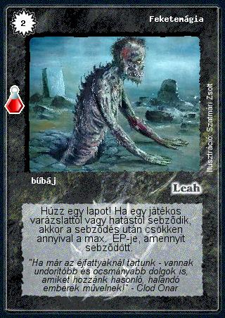 Kiadás: Esthar Császárság Gyakoriság: nem gyakori Lapszín (isten): Leah Típus: bűbáj Szöveg: Húzz egy lapot! Ha egy játékos varázslattól vagy hatástól sebződik, akkor a sebződés után csökken annyival a max. ÉP-je, amennyit sebződött. Szinesítő szöveg: "Ha már az éjfattyaknál tartunk - vannak undorítóbb és ocsmányabb dolgok is, amiket hozzánk hasonló, halandó emberek művelnek!" - Clod Onar Illusztráció: Szatmári Zsolt