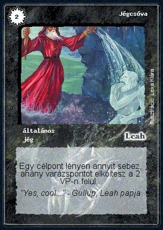 Kiadás: Alappakli, 1. kiadás, Alappakli, 2. kiadás, Alappakli, 3. kiadás, Alappakli, 4. kiadás Gyakoriság: gyakori Lapszín (isten): Leah Típus: általános Altípus: jég Szöveg: Egy célpont lényen annyit sebez, ahány varázspontot elköltesz a 2 VP-n felül. Szinesítő szöveg: "Yes, cool..." - Gullup, Leah papja Illusztráció: Lexa Klára