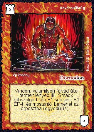 Kiadás: Chara-din visszatér Gyakoriság: ritka Lapszín (isten): Dornodon Típus: építmény Szöveg: Minden, valamilyen falvad által termelt lényed ill. Smack rabszolgád kap +1 sebzést, +1 ÉP-t, és mostantól bemehet az őrposztba (egyedül is). Illusztráció: Markó Gábor