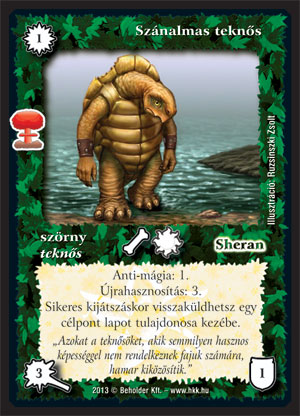 Kiadás: Világégés Gyakoriság: gyakori Lapszín (isten): Sheran Típus: szörny Altípus: teknős Szöveg: Anti-mágia: 1. Újrahasznosítás: 3. Sikeres kijátszáskor visszaküldhetsz egy célpont lapot tulajdonosa kezébe. Szinesítő szöveg: "Azokat a teknősöket, akik semmilyen hasznos képességgel nem rendelkeznek fajuk számára, hamar kiközösítik." Illusztráció: Ruzsinszki Zsolt