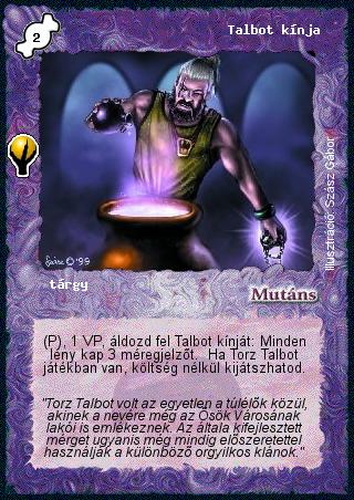 Kiadás: Alappakli, 5. kiadás (Ősök városa), Alappakli, 6. kiadás (Ősök Városa), Alappakli, 7. kiadás (Ősök Városa) Gyakoriság: ritka Lapszín (isten): Mutáns Klán Típus: tárgy Szöveg: (P), 1 VP, áldozd fel Talbot kínját: Minden lény kap 3 méregjelzőt. Ha Torz Talbot játékban van, költség nélkül kijátszhatod. Szinesítő szöveg: "Torz Talbot volt az egyetlen a túlélők közül, akinek a nevére még az Ősök Városának lakói is emlékeznek. Az általa kifejlesztett mérget ugyanis még mindig előszeretettel használják a különböző orgyilkos klánok." Illusztráció: Szász Gábor
