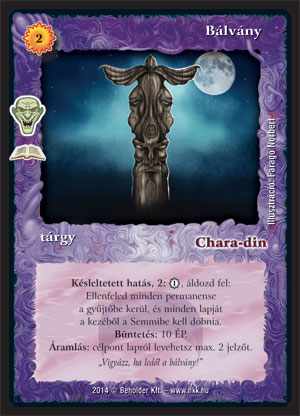 Bálvány (8): Önmagában kijátszva nem egy túl jó lap. A két kör elég sok, amíg elfogynak a késleltetett hatás jelzők. Igaz, a büntetése segít egy picit, hogy megérje azt a két kört, de ennyi idő alatt simán elveszíthetjük a játékot is. Szerencsére az áramlásos képessége sokat dob a lapon. Egyrészt saját magával is kombózik. Persze, még így sem olyan jó, hiszen 2 zanszilánkért, 2 VP-ért és 2 lapért szedjük le az ellenfél asztalát, és dobatjuk el a teljes kezét. Nem túl olcsó, és két Bálvány kell hozzá. Azonban a lap igazi erejét az adja, hogy az Időzített gomba kombós pakliban remek lap a jelzőleszedős képessége miatt. Oda mindenképpen használjuk! További lapok, amikkel kombózhat: A türelem rózsája, Megfelelő alkalom.